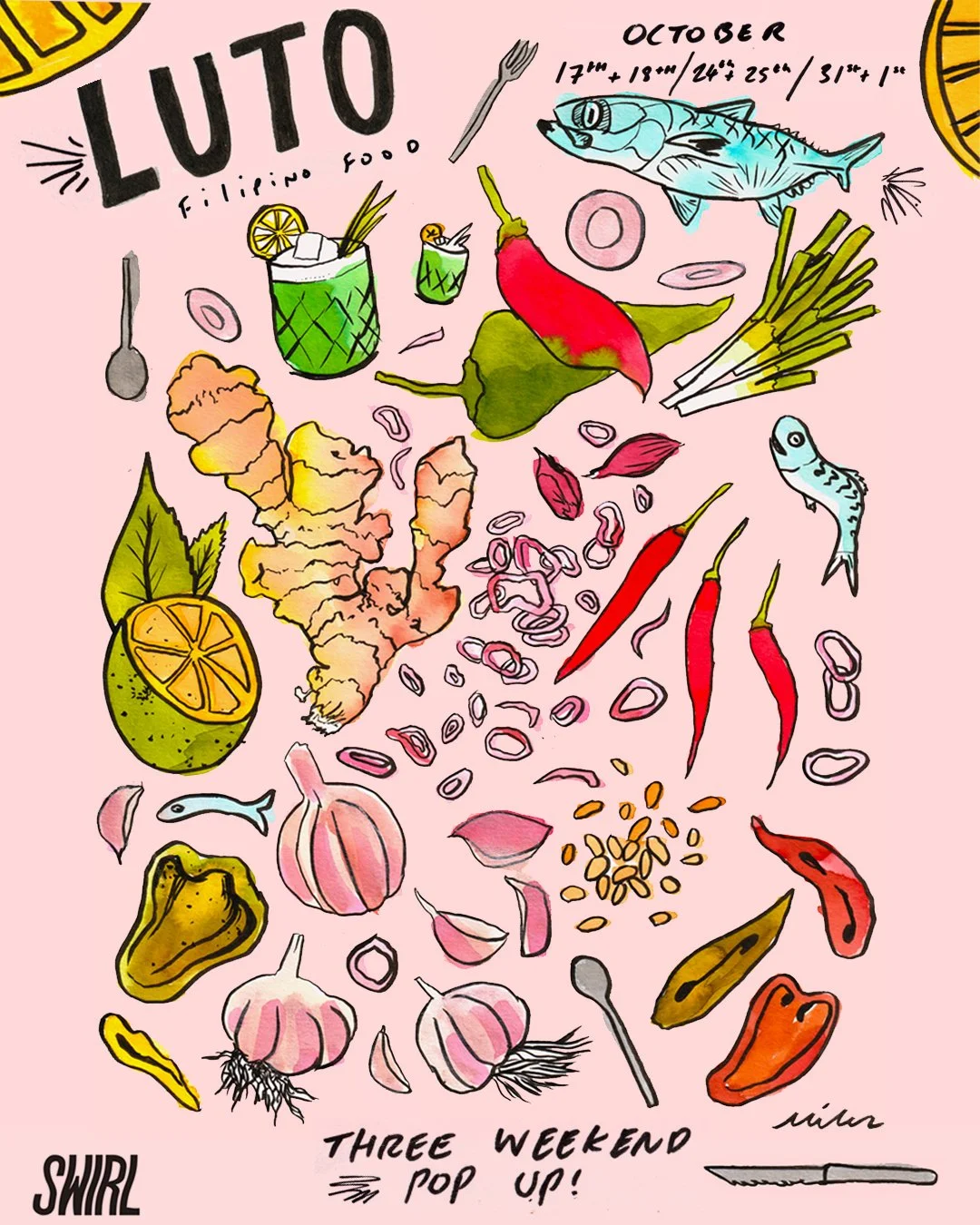 Hand-drawn posters for seasonal events, pop-ups, and specials at Swirl, an East London wine bar.